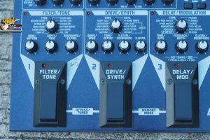 – 3 footswitches and onboard expression pedal routed to 6 options like Octave, Wah, etc.